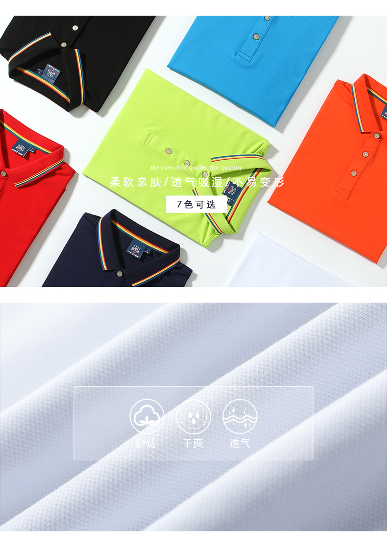 目前市面上普通Polo、T恤支數(shù)在28S左右,此款產(chǎn)品采用為40S密度,這才是高支高密面料,紗支細、密度高、面料柔軟,吸濕排汗不捂汗